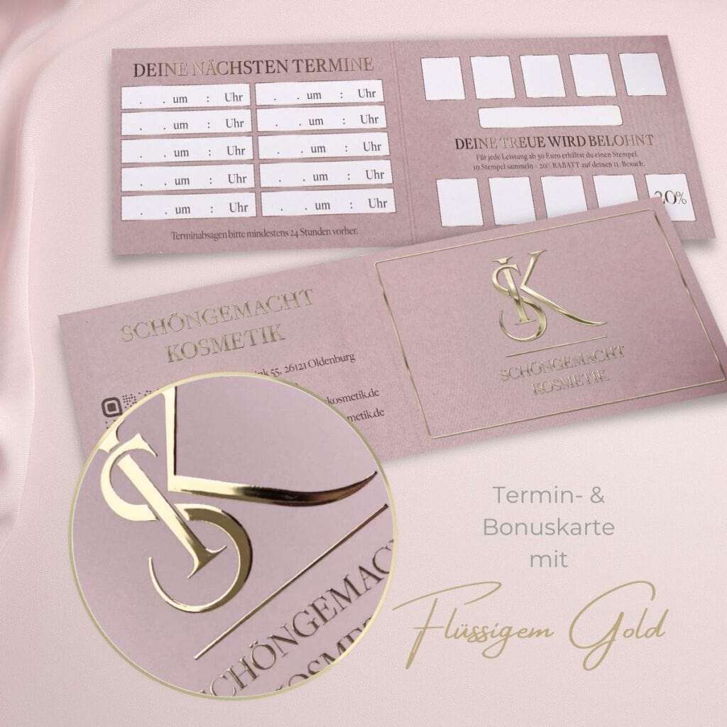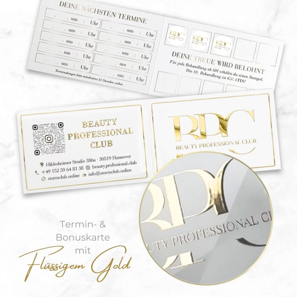Démarquez-vous de la foule ! Grâce à nos cartes de rendez-vous uniques, personnalisées et glamour avec des champs de bonus, vous êtes sûr de différencier votre institut de beauté. Ce n’est que dans le secteur de la beauté, qu’il s’agisse d’un institut de beauté, d’un salon de manucure ou d’un cabinet de conseil en dermatologie, que vous trouverez des supports marketing aussi exclusifs, conçus par des professionnels ! Nous sommes le leader du marché dans le secteur de la beauté et nous rendons votre salon aussi brillant que votre travail rend vos clients brillants. Nous vous attendons avec impatience !