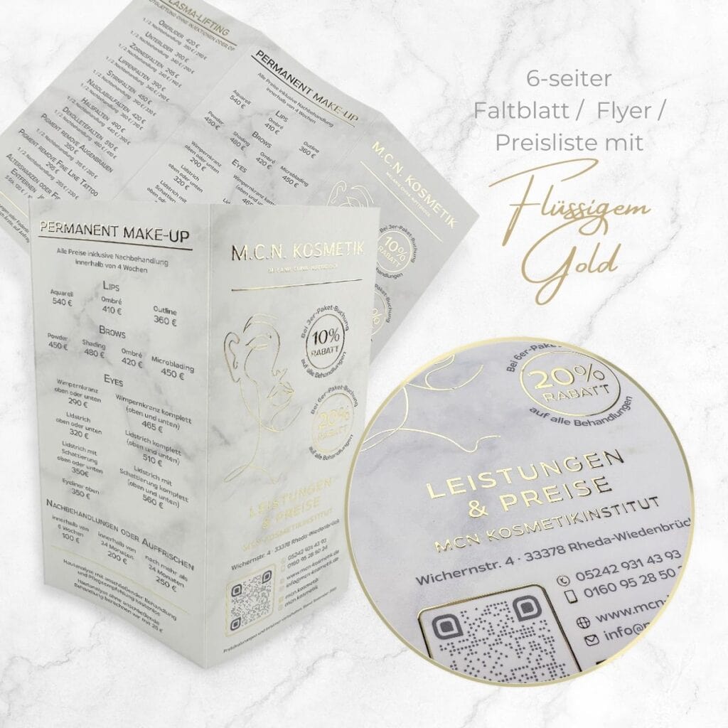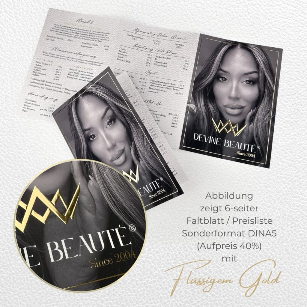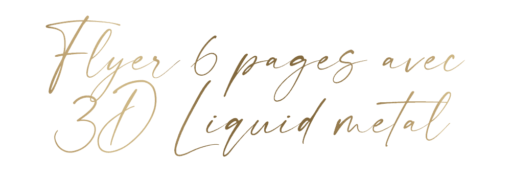 Distribuez aux nouveaux clients potentiels ce dépliant exclusif avec une finition or liquide ou argent liquide et rendez-les déjà heureux avec ce précieux polycopié. Qu’il s’agisse d’un dépliant de 6 pages pour vos soins esthétiques, vos traitements PMU, votre pédicure, votre blanchiment des dents ou d’autres applications de beauté, vos clients seront immédiatement séduits par le design personnalisé et la qualité supérieure.