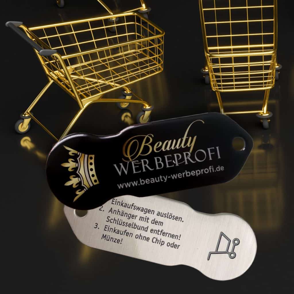 Nous sommes là pour vous aider. En effet, avec notre jeton de caddie luxueux et de haute qualité, vous faites d’une pierre deux coups : votre client a votre publicité en main et sous les yeux à chaque fois qu’il fait ses courses et, en outre, la recherche de l’euro est également de l’histoire ancienne. Si votre propre jeton de caddie se trouve à l’avenir sur le porte-clés de vos clients, tout le monde sera heureux et satisfait.