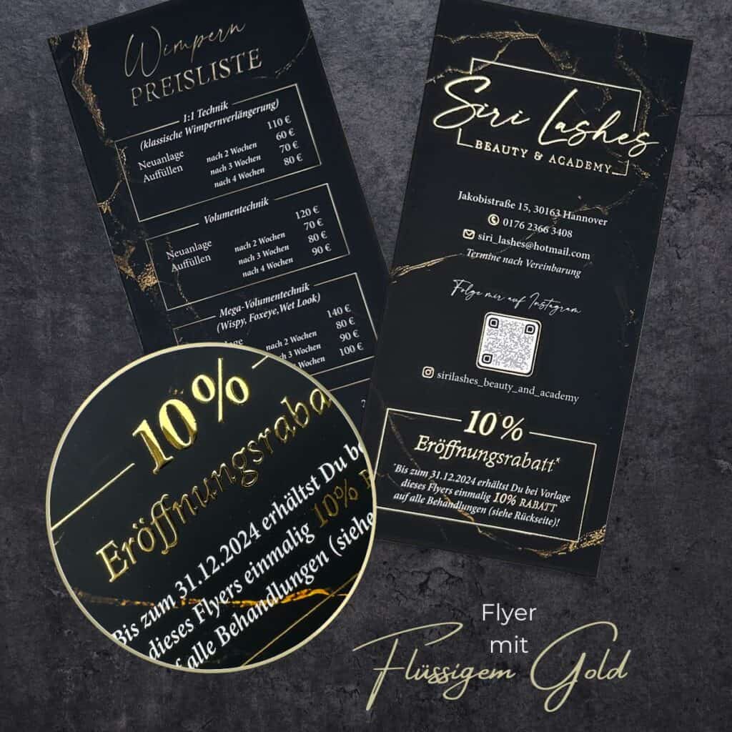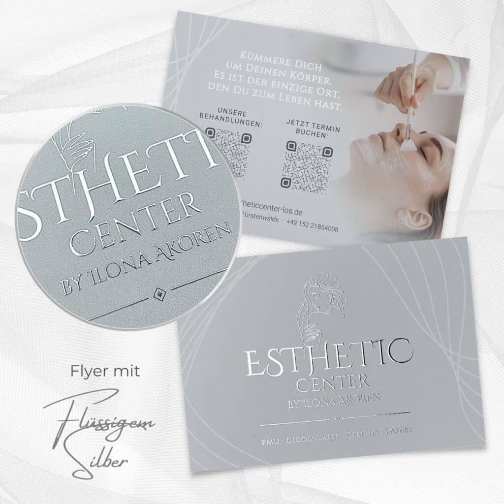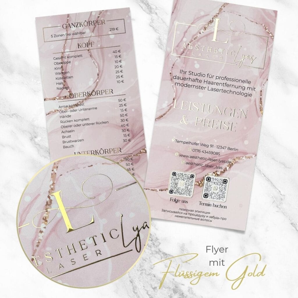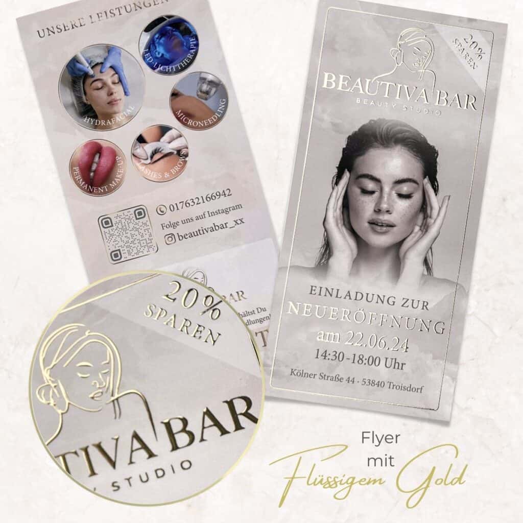 Distribuez à vos nouveaux clients potentiels ce dépliant exclusif avec finition or liquide ou argent liquide et rendez-les déjà heureux avec ce précieux polycopié. Qu’il s’agisse d’un dépliant cosmétique, d’un traitement PMU, d’une pédicure, d’un blanchiment des dents ou de toute autre application de beauté, vos clients seront immédiatement séduits par le design personnalisé et la qualité supérieure.